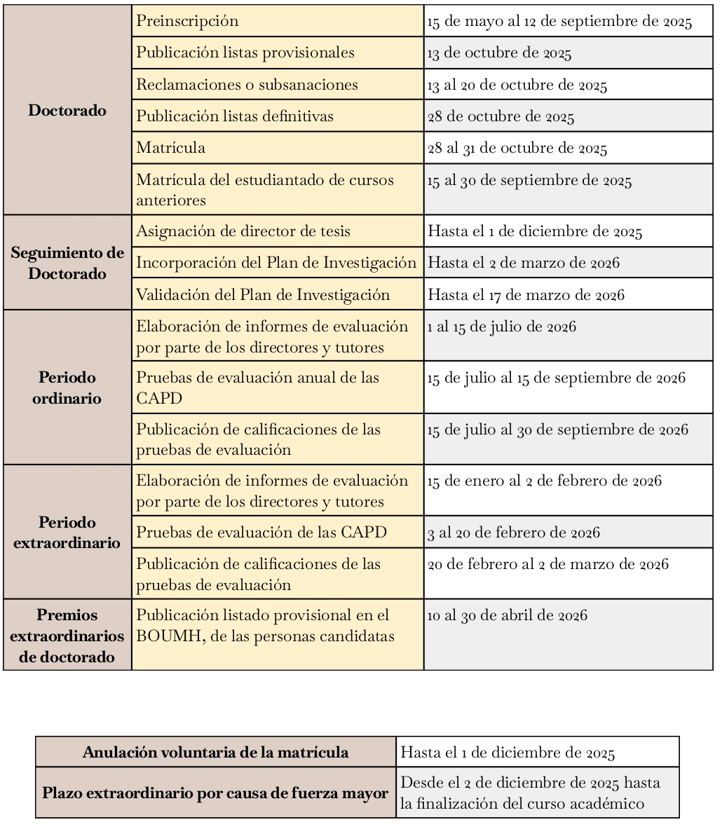 Los estudios de doctorado podrán llevarse a cabo a tiempo completo (4 años) o a tiempo parcial (7 años), aunque esta necesitará la aprobación de la CAPD. Ambos plazos computan desde la fecha de matrícula hasta el depósito de la tesis.