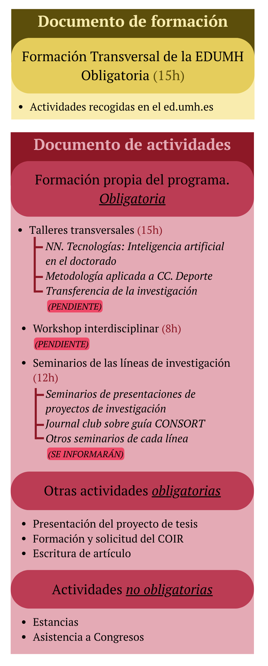 En esta sección se recoge la información básica para el seguimiento académico y administrativo del Programa de Doctorado en Deporte y Salud. Aquí el estudiantado podrá consultar aspectos relevantes relacionados con el calendario académico, los principales trámites, las actividades formativas y el proceso de evaluación, depósito y defensa de la tesis doctoral.